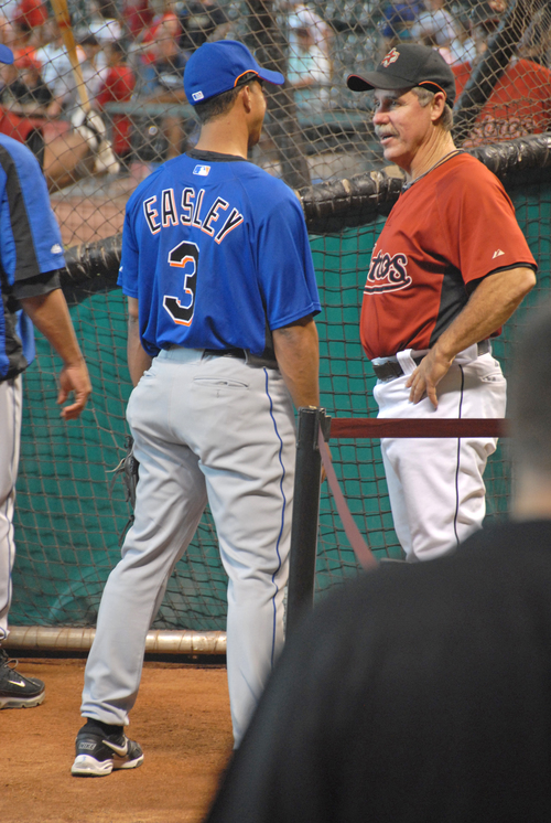 Back in our hotel following Saturday’s win, we were astonished to read online that Oliver Perez would be missing his start the next day because of back problems. That same evening, I was looking over the photos I had taken at the game, including this shot of the Mets congratulating each other on the field. As I looked at this photo, I did a double-take: could El Duque be to blame for Perez’s injury? Doesn’t it look like he’s about to give him a noogie? Was some day-off horse-play to blame here? Maybe my camera had inadvertently captured some kind of evidence!