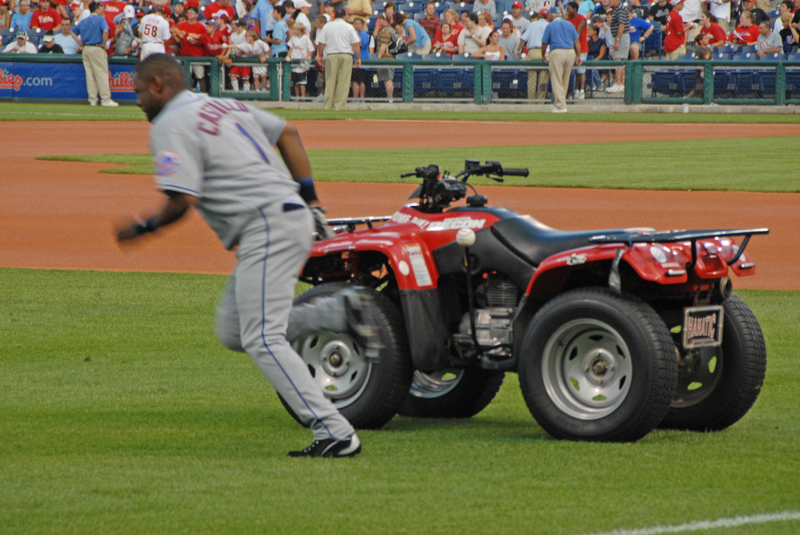 Not to be outdone by LoDuca’s theatrics, Luis Castillo crept up to the Phanatic’s little dune buggy and did something.