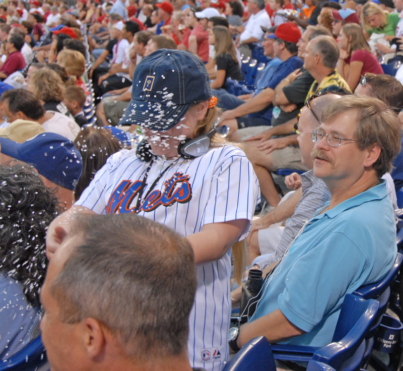 (1) Tuesday was my daughter’s birthday and we attended the game at her request. "Happy Birthday" was sung to her by–yes, believe it or not–Phillies fans! (I had not ruled out the possibility that fans that are capable of booing their own players for any minor infraction, their own manager, heck–even Santa Claus–might boo a ten-year-old kid in Mets gear celebrating a birthday, but they did not.)